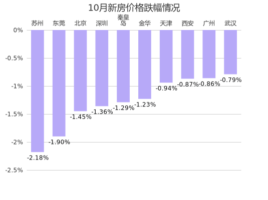 10月价格环比跌落城市的数量为56个,与上月比较削减24个。跌幅居前十位的城市依次是:姑苏-2.18%、东莞-1.90%、北京-1.45%、深圳-1.36%、秦皇岛-1.29%、金华-1.23%、天津-0.94%、西安-0.87%、广州-0.86%、武汉-0.79%。