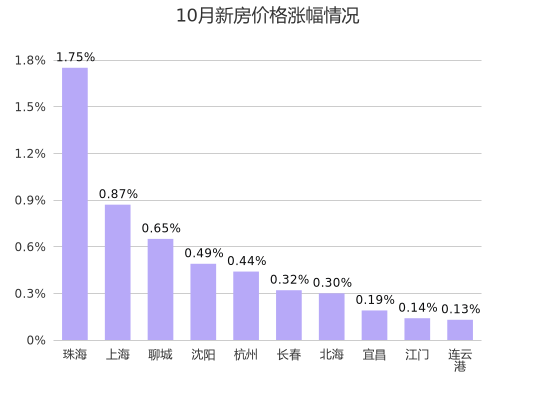 10月新房价格环比上涨城市的数量为25个,与上月比较添加14个。涨幅居前十位的城市依次是:珠海1.75%、上海0.87%、聊城0.65%、沈阳0.49%、杭州0.44%、长春0.32%、北海0.30%、宜昌0.19%、江门0.14%、连云港0.13%。