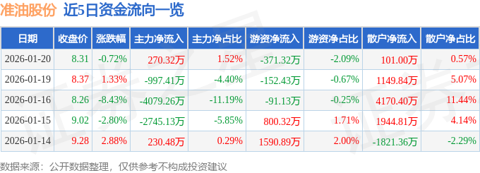 证券之星音讯,到2026年1月20日收盘,准油股份(002207)报收于8.31元,跌落0.72%,换手率8.24%,成交量21.5万手,成交额1.78亿元。